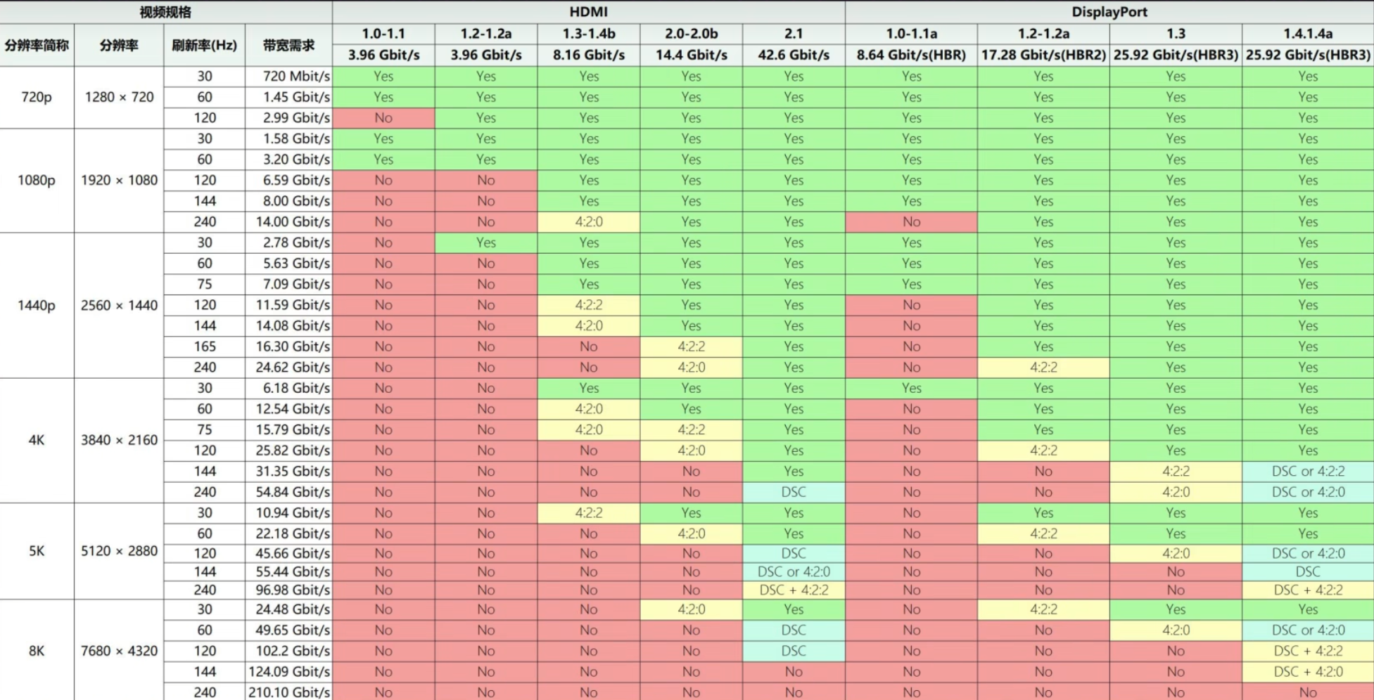 2、DP、HDMI子协议带宽及支持规格图(图源:硬件茶谈)