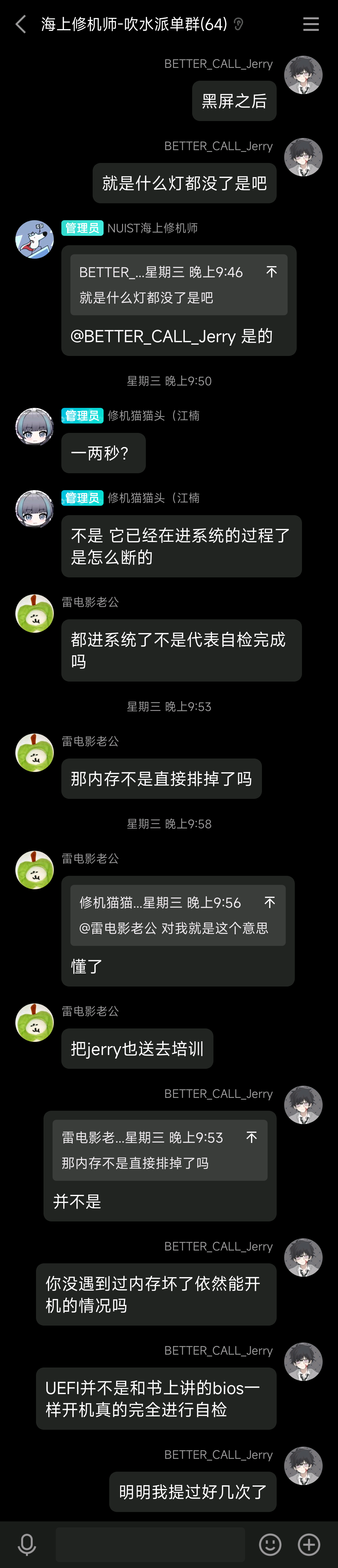 再说uefi,bios之所以需要POST的一个重要原因是,bios不能存储电脑已有的硬件信息,所以每次上电都需要重新初始化并进行配置。但是在uefi中,我们可以存储设备信息(这就是为什么重置cmos,(一般“放电”时同时进行的)是有用的),不需要每次都读取一次。同时,各个设备的init操作也变成类似懒加载的形式,在需要时调用。所以,在实际的问题中,可能会出现正常开机通过UEFI甚至进入系统之后才被内存或者硬盘引起的黑屏。