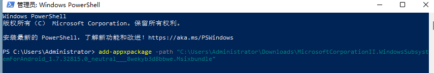 add-appxpackage -path "C:\Users\Administrator\Downloads\MicrosoftCorporationII.WindowsSubsystemForAndroid_1.7.32815.0_neutral___8wekyb3d8bbwe.Msixbundle"