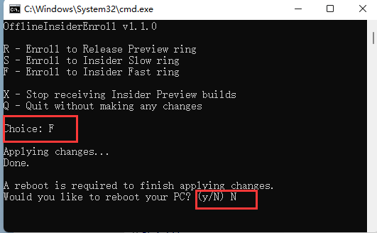 - 使用管理员权限执行 OfflineInsiderEnroll.cmd,Choice:F,reboot your PC:N。