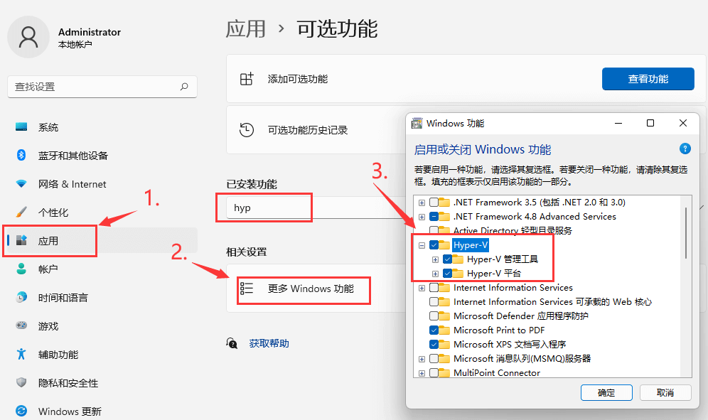 注1:家庭版默认没有Hyper-V功能,需要额外脚本开启: