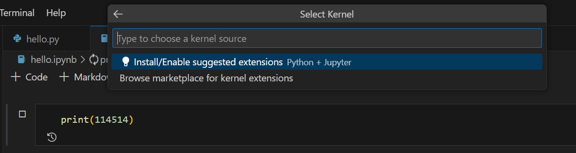 打开vsc,随便找个地方新建个.ipynb文件,如"hello.ipynb"